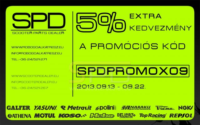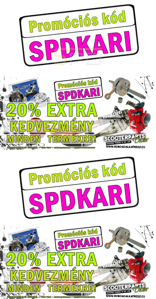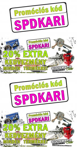 Az "SPDKARI" promóciós kódot a megszokott helyen a webes megrendelés utolsó lépésében kell megadni, a kód beírását követően lényeges, hogy aktiváljuk a kódot az enter billentyű lenyomásával. Ha mindent jól csináltunk már a kedvezményes árakat láthatjuk. A promócióval kapcsolatos kérdéseket az info@robogoalkatresz.eu mail címen, vagy a 06-24/521-271-es telefonszámon tudjátok feltenni.